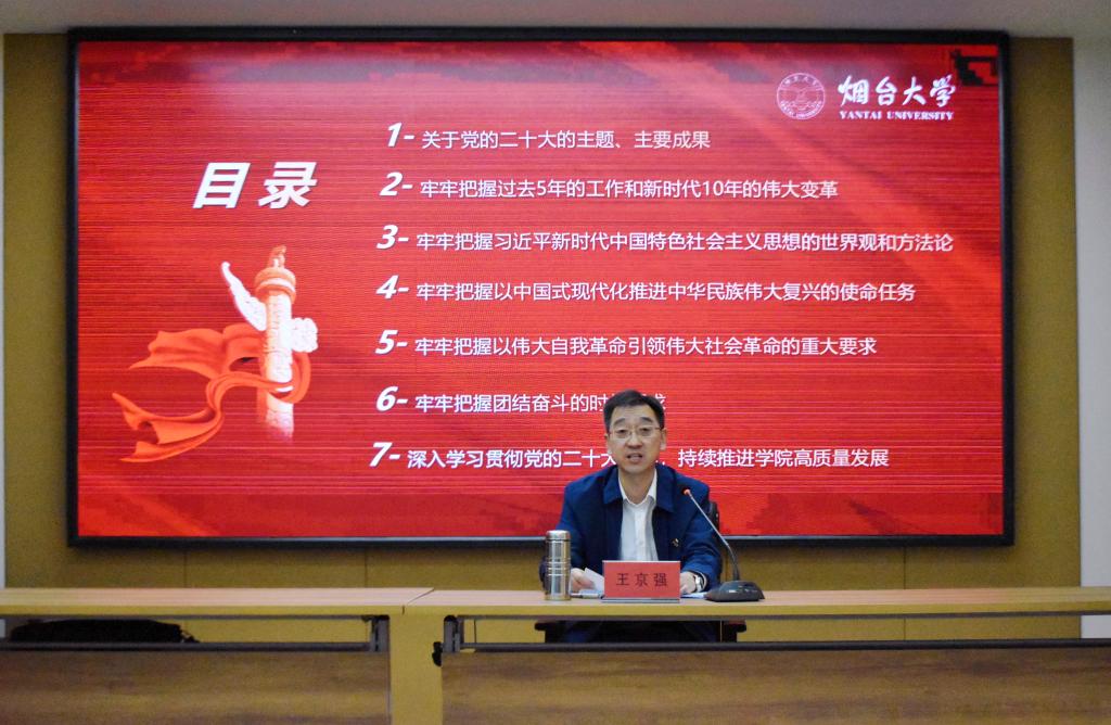 在报告中,王京强紧紧围绕党的二十大的主题和主要成果,讲解了我们党和国家过去五年的工作和新时代十年的伟大变革及其重大意义;分析了马克思主义必须中国化,中国化马克思主义必须时代化的历史逻辑和实践逻辑,阐释了习近平新时代中国特色社会主义思想的世界观和方法论;讲解了中国式现代化的中国特色和本质要求,解读了全面建设社会主义现代化国家目标任务、坚持党的全面领导和全面从严治党的重大部署;明晰了团结奋斗的时代要求。他结合学院工作实际,就深入学习宣传贯彻党的二十大精神、不断开创学院高质量发展新局面做出部署、提出要求。王京强指出,党的二十大指明了党和国家事业的前进方向,是我们党坚持和发展中国特色社会主义的政治宣言和行动纲领。他强调全院上下把学习宣传贯彻党的二十大精神作为当前和今后一个时期的首要政治任务,深刻领悟“两个确立”的决定性意义,增强“四个意识”,坚定“四个自信”,做到“两个维护”,不断增强政治判断力、政治领悟力、政治执行力,自觉在思想上政治上行动上同以习近平同志为核心的党中央保持高度一致。学院教职工要在全面学习、全面把握、全面落实上下功夫,切实把党的二十大做出的新部署、提出的新要求,落实到推动学院内涵建设和高质量发展全过程各方面,努力在思想政治理论课改革创新上当先锋,在落实立德树人根本任务上做表率,切实发挥好思政课主渠道作用。广大青年学生要牢记习近平总书记的殷殷嘱托,立志做有理想、敢担当、能吃苦、肯奋斗的新时代好青年,坚定不移听党话、跟党走,在青春的赛道上,争取跑出当代青年的最好成绩,努力成为堪当民族复兴重任的时代新人。