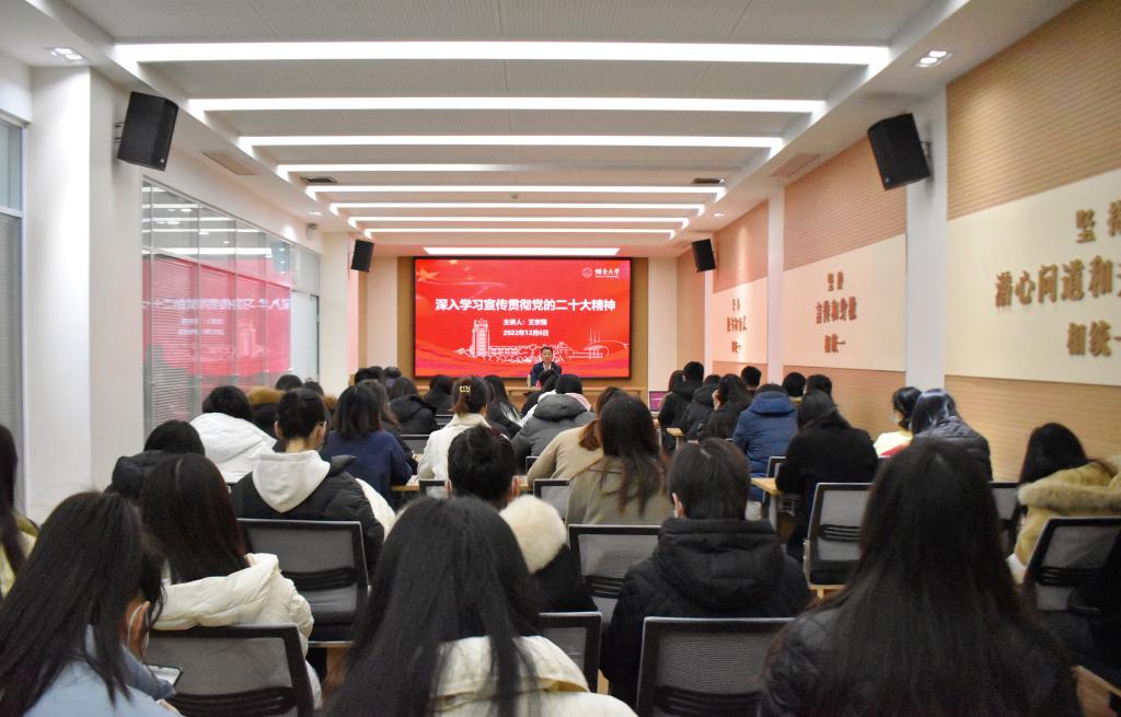 学习贯彻党的二十大精神宣讲会在学院305多功能会议室召开,学院党总支书记王京强作《深刻理解“五个牢牢把握”,深入学习贯彻党的二十大精神 》专题报告,思政课教师代表和全体研究生参加会议。