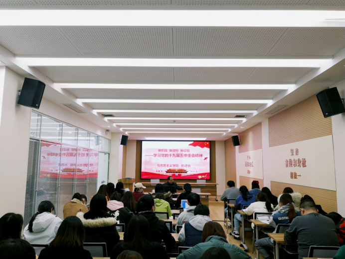杜书记结合自身亲身经历与社会现实,详细解读了本次会议的精神要点。首先,本次全会充分肯定了党的十九届四中全会以来中央政治局的工作,在新时代把中国特色社会主义更加有力地向前推进,决胜全面建成小康社会取得了决定性成就。会议同时指出,我国发展环境面临着深刻复杂的变化,会议确定了到二零三五年基本实现社会主义现代化远景目标。“十四五”时期经济社会发展指导思想和必需遵守的原则、主要目标、工作要求。最后,杜书记指出,作为新时代的大学生,要在马克思主义理论学习中、从历史的演进中和中国特色社会主义伟大实践中坚定理想信念;在增强对中国特色社会主义理论体系认同中,从实践中认识和掌握马克思主义世界观与方法论中保持高度的理论自觉;要深入基层和实践,全面了解国情社情民情,不断增长人生经验和社会知识,提高为人民群众服务的能力。