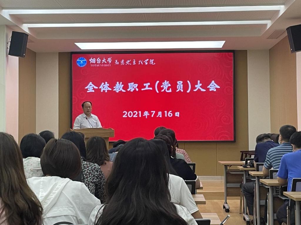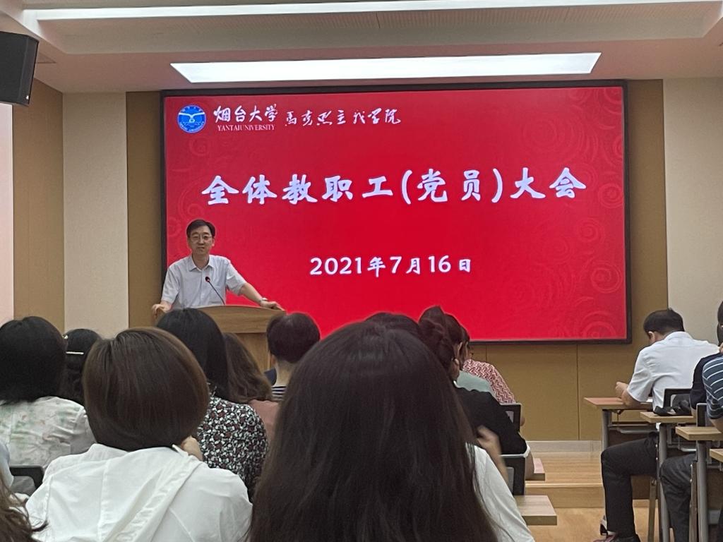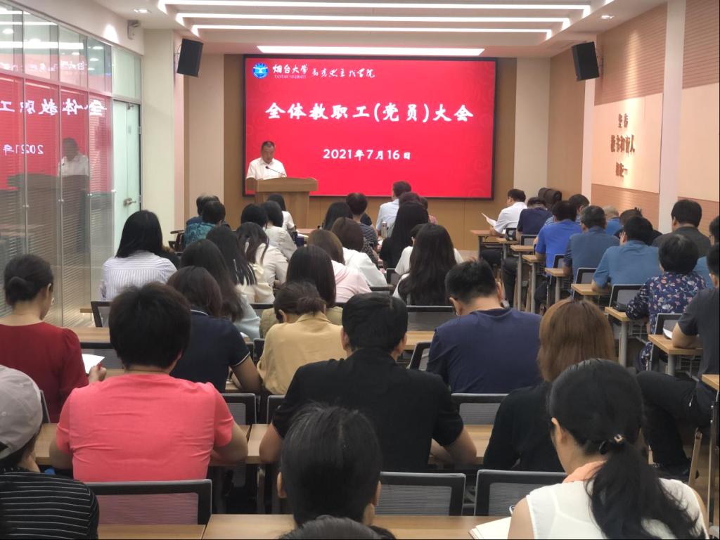 在多功能会议室召开大会,学院领导班子和全体教职工及党员参加会议。会议由学院党总支书记王京强主持。