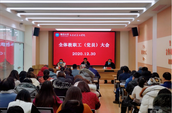 在多功能会议室召开大会,学院领导班子和全体教职工及党员参加会议。会议由学院党总支书记王京强同志主持。