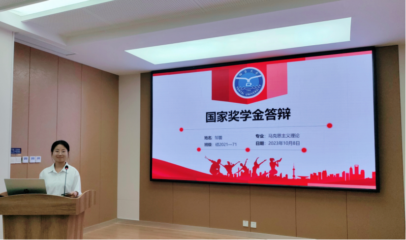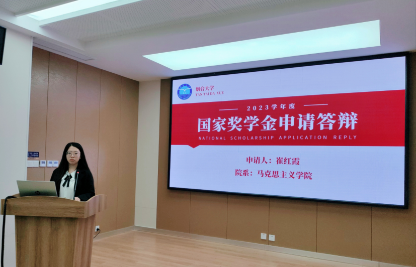 杜德省首先传达了学校的相关文件精神,介绍了国家奖学金的评审细则和答辩要求。经过前期个人申报、学院审核,共有3名同学参与此次答辩。根据抽签顺序,崔红霞、邹蕾、姜文政3位同学依次上台,就思想、学习、科研、社会实践等方面进行答辩展示。