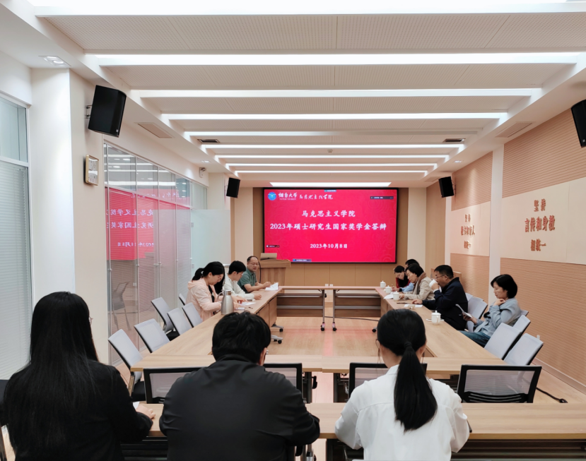 在305会议室举行2023年硕士研究生国家奖学金答辩会。学院党政领导、导师代表、辅导员、研究生代表、国家奖学金申请人参加答辩会,2022、2023级硕士研究生线上观摩学习。答辩会由党总支副书记杜德省主持。