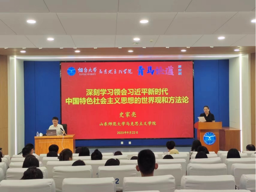 第四期“青马论道”大讲堂在承先图书馆报告厅举行。山东师范大学史家亮教授受邀作“深刻学习领会习近平新时代中国特色社会主义思想的世界观和方法论”专题报告。报告会由院长王毅主持,学院青年教师、研究生导师和全体研究生参加。
