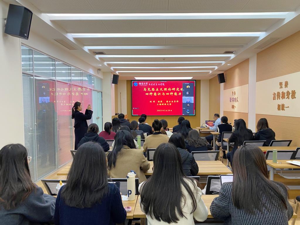 副院长、博士生导师刘洋教授作了题为“马克思主义理论研究的“四个意识”与四种能力”的学术报告。报告由学院党总支副书记杜德省主持,青年教师代表和马克思主义理论专业全体研究生参加。