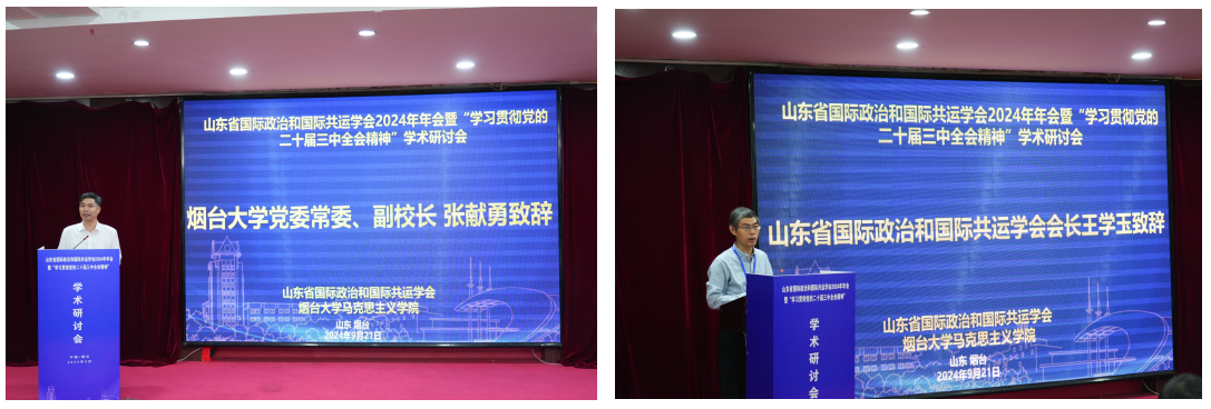副校长张献勇致欢迎辞,山东省国际政治和国际共运学会会长王学玉致辞。
